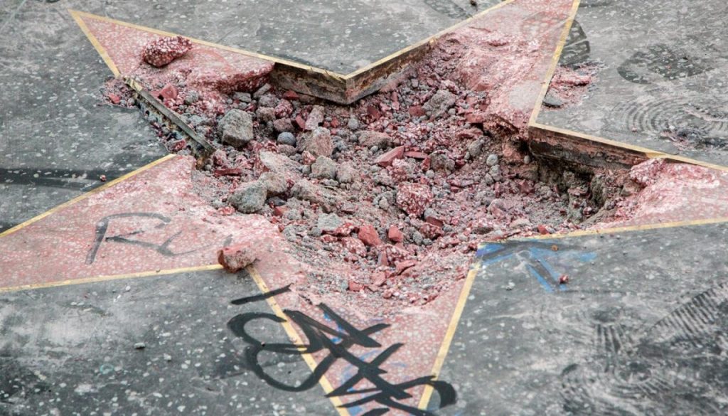 Steaua lui Donald Trump de pe Aleea Vedetelor din Hollywood a fost distrusă, informează The Guardian. Agenții de poliție au sosit la locul incidentului după ce un bărbat a distrus cu un instrument electric de foraj steaua lui Donald Trump de pe Walk of Fame. Rapoartele susțin că înainte de a distruge steaua, bărbatul a scos instrumentele dintr-o husă de chitară. Suspectul a fost arestat și a primit o amendă în valoare de 20.000 de dolari după ce a distrus steaua de pe Aleea Vedetelor din Hollywood. Anterior, aceasta a mai fost ținta unor atacuri însă de această dată, steaua a fost distrusă aproape în totalitate.